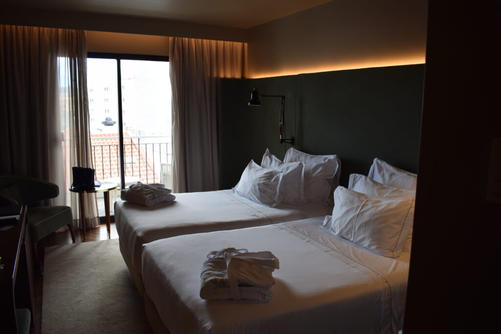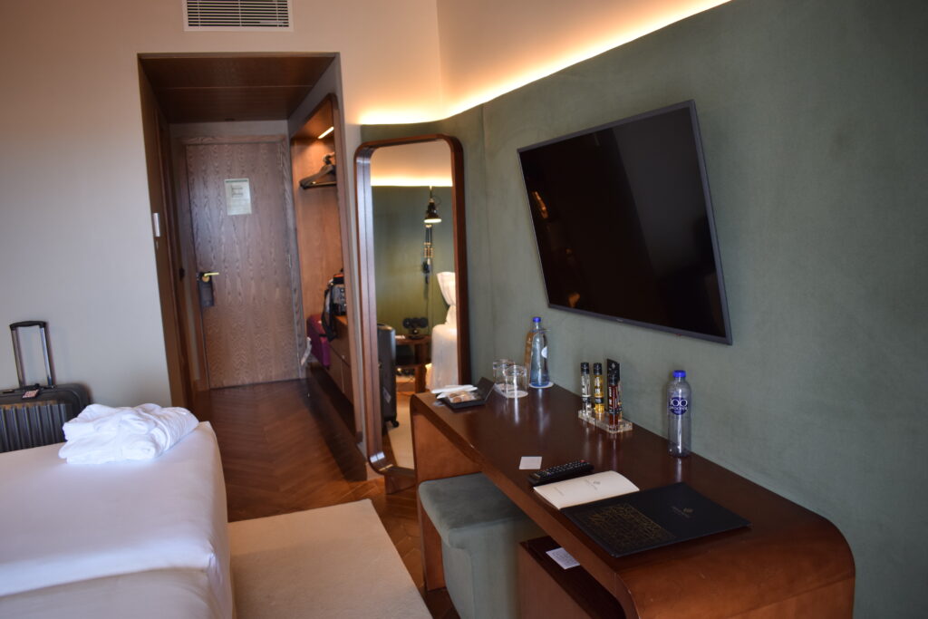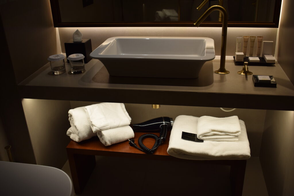 Værelset var lækkert og i samme elegante stil som resten af hotellet, med de mørke farver og de fine detaljer. Vi havde også en altan og en delvis udsigt ud mod havnebadet, hvilket var virkelig hyggeligt, især om morgenen og sidst på dagen, hvor man kunne sidde lidt ude og nyde stemningen.