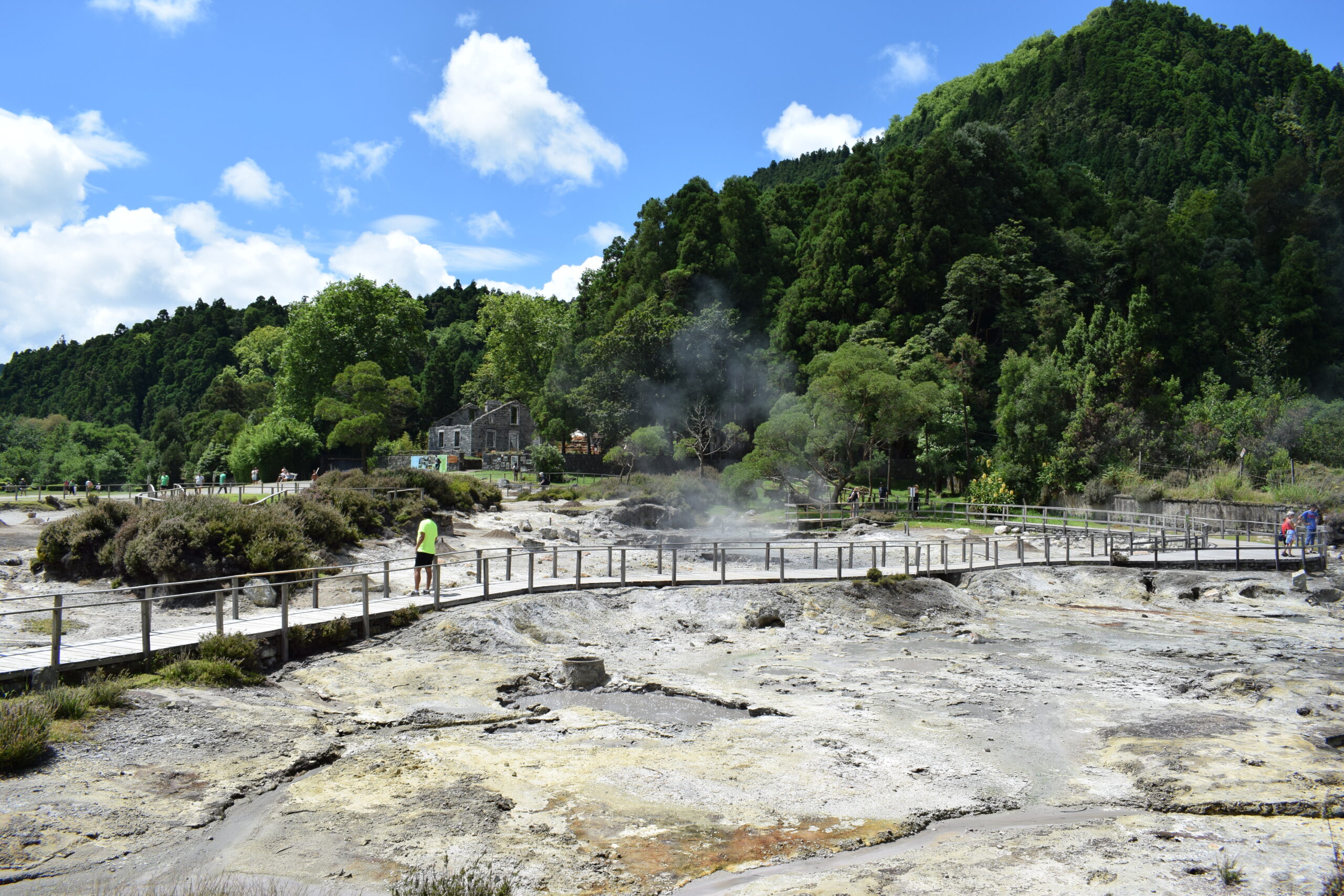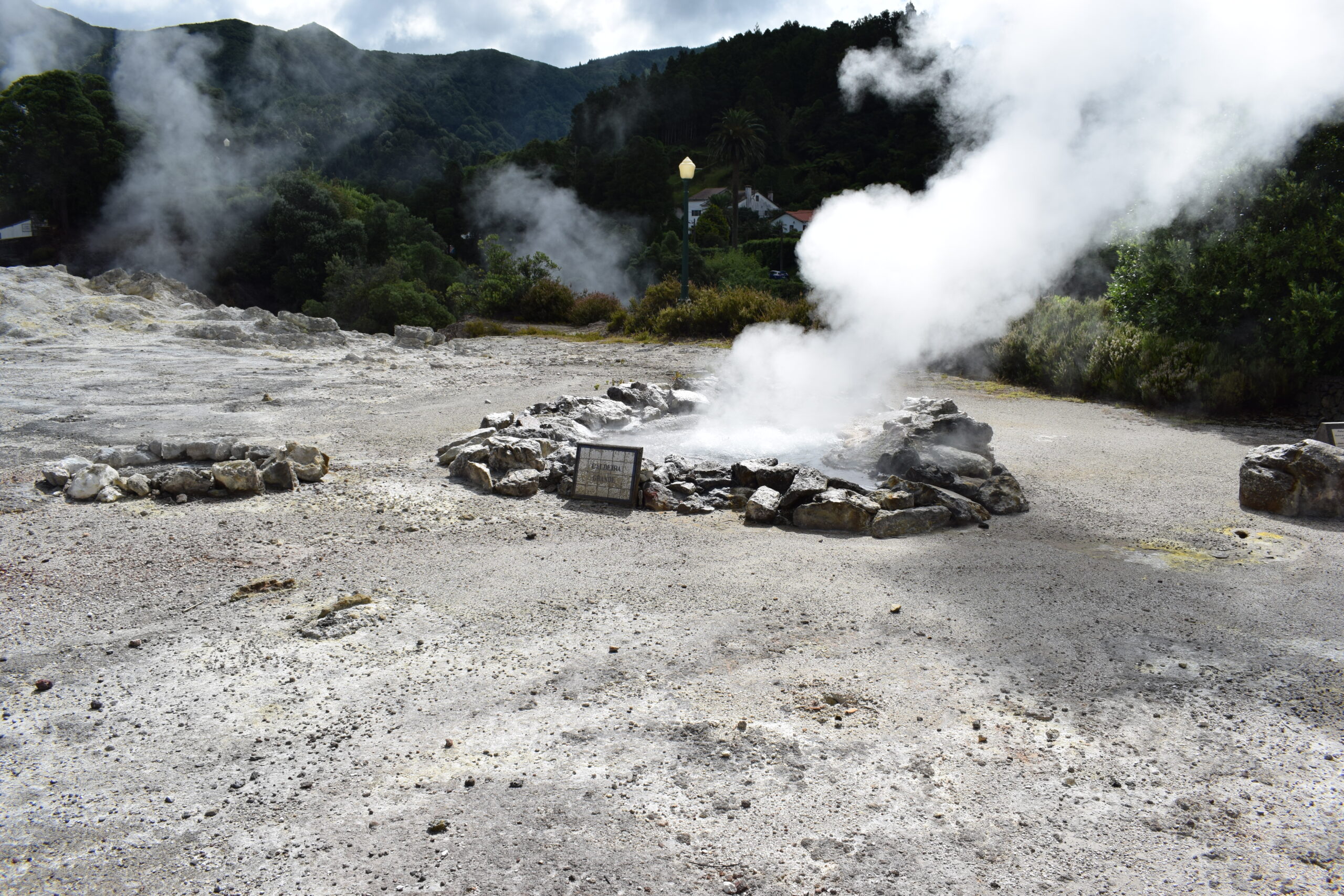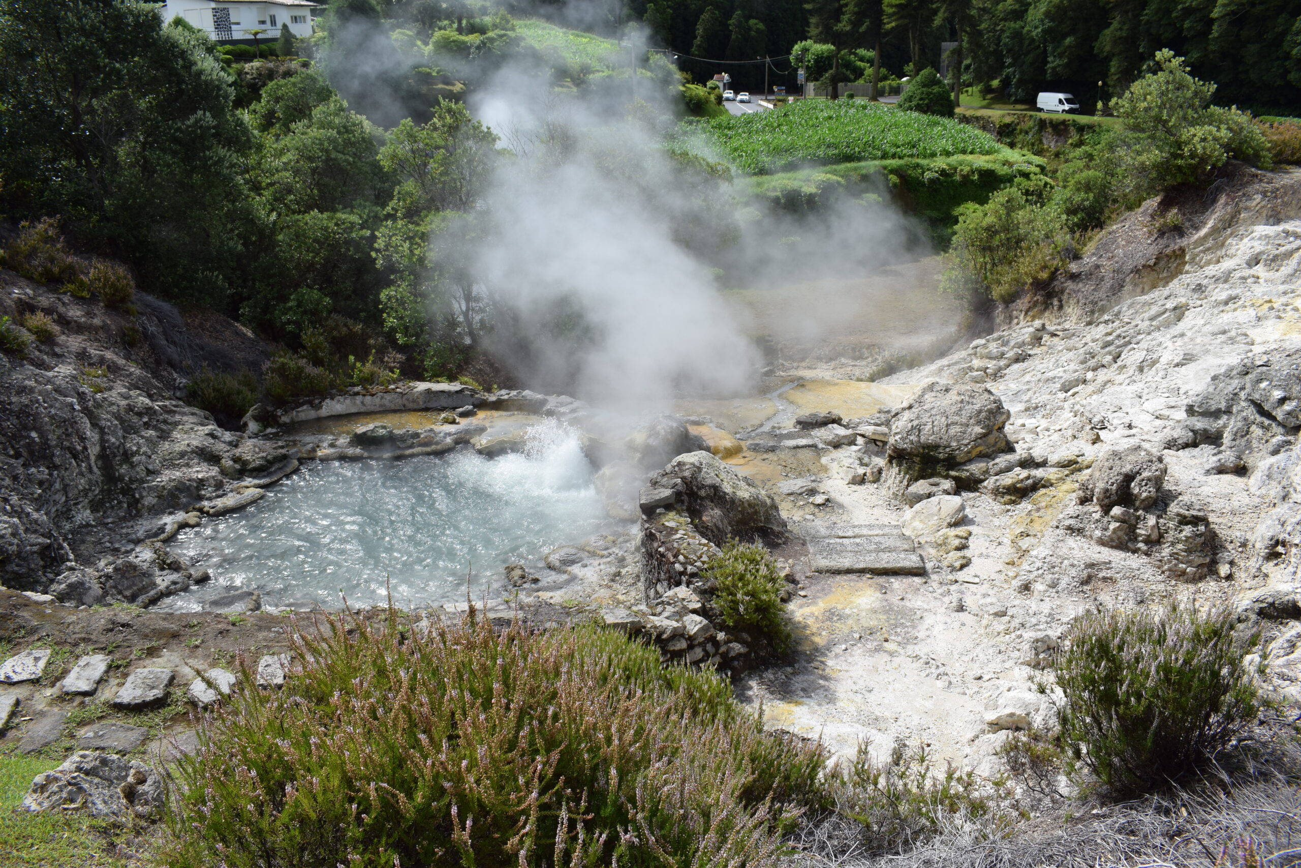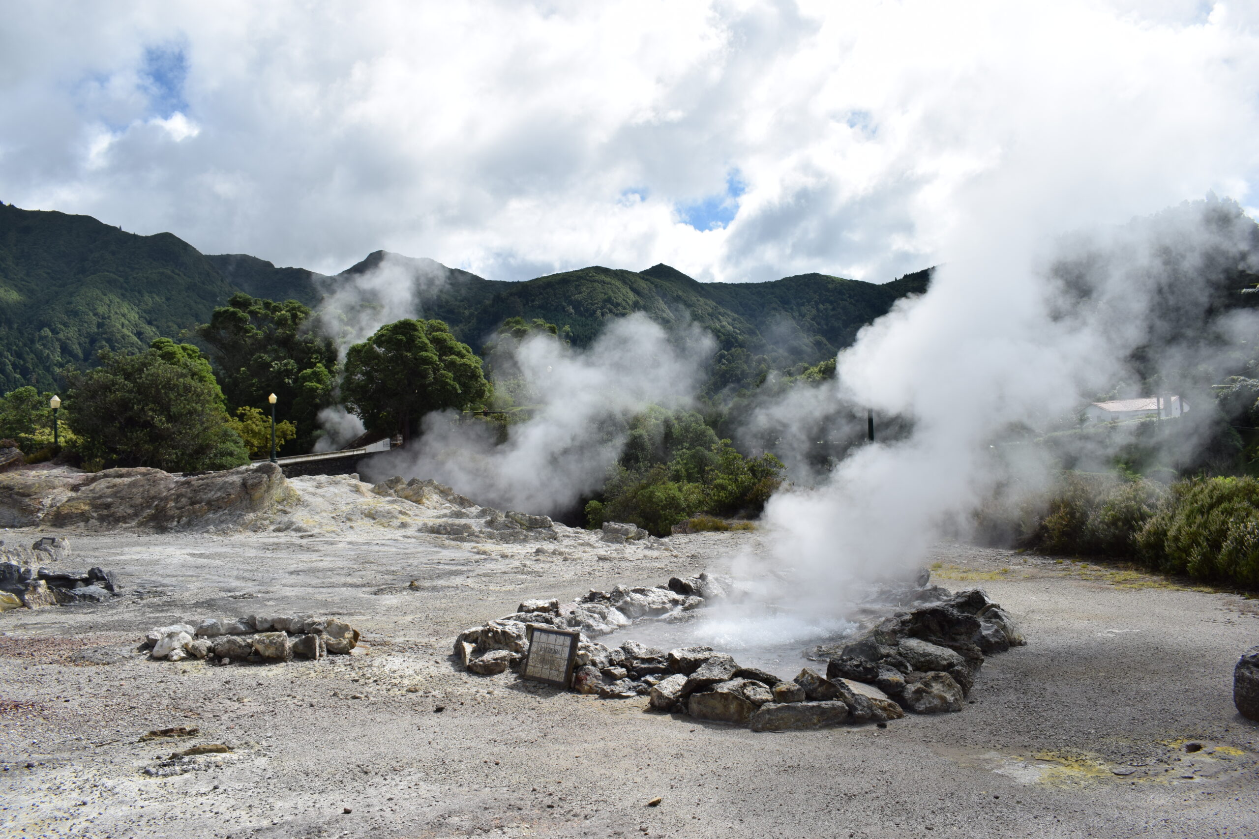 På Azorernes oplevet vi, vulkanske aktivitet på helt tæt hold. Furnas på São Miguel, ligger i et aktivt vulkansområde. Her boblede og kogte jorden flere steder, grundet den aktive vulkan, og der stod damp og røg op fra undergrunden, mens luften tydeligt lugtede af svovl, ret vildt at se i virkeligheden. Vi var også forbi Lagoa das Furnas, hvor man laver den lokale vulkanmad, der er en gryden der bliver gravet ned i jorden og maden bliver så tilberedt langsomt af varmen nedefra. Senere spiste vi vulkanskmad på restaurant, det blev til en stor gang blandet kød- og grøntsagsservering, en meget Azorerne-agtig oplevelse, og en sjov måde at smage naturen store kræfter på Azorerne i Portugal.