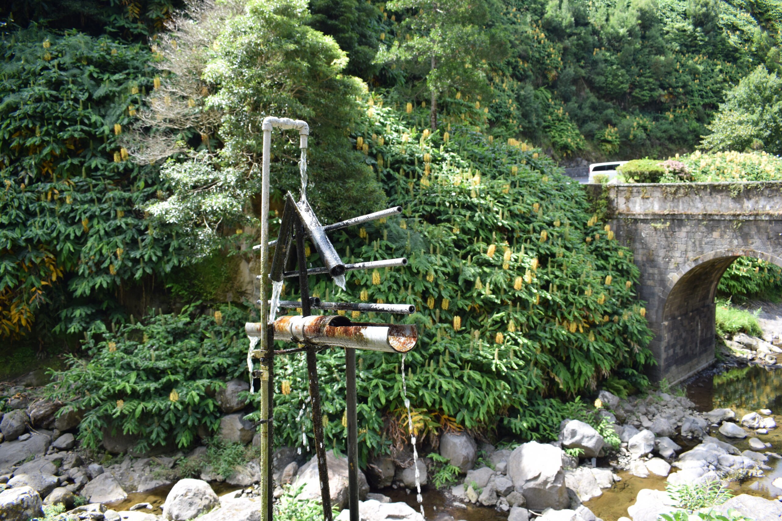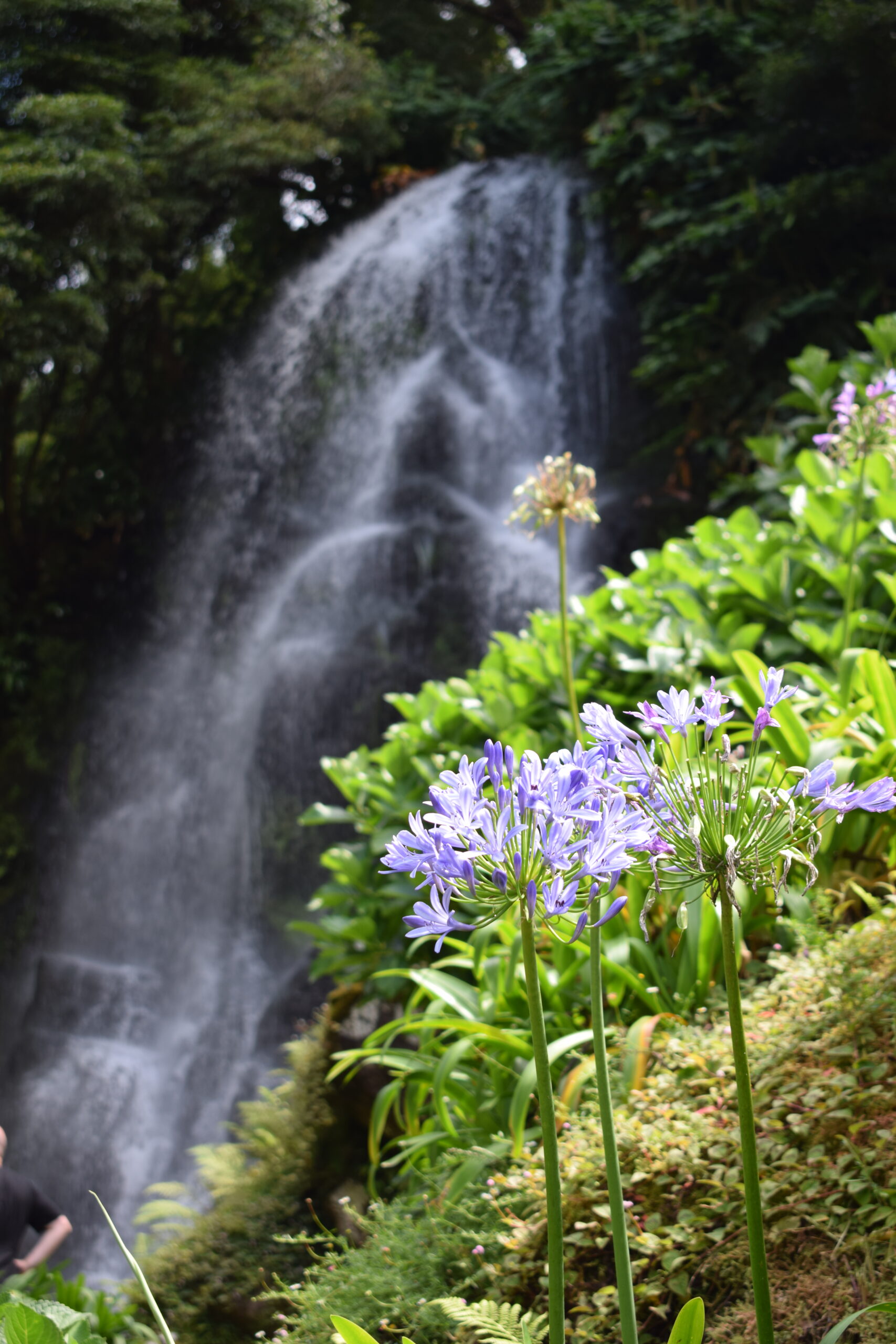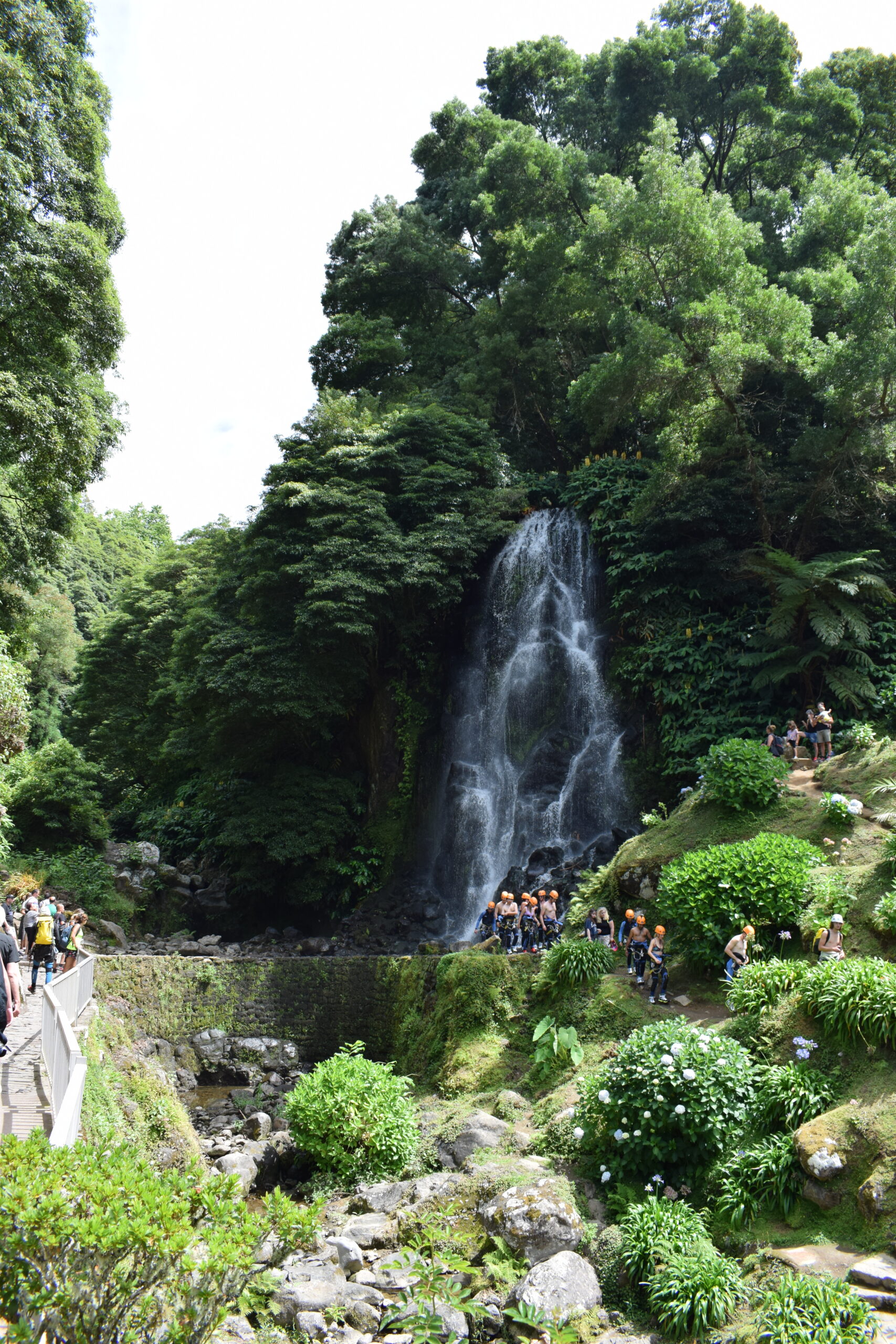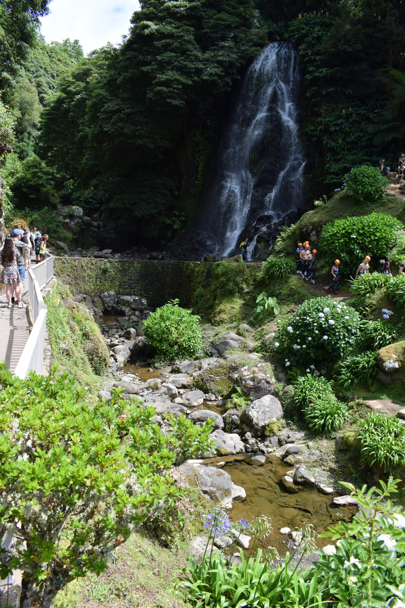 Vi var forbi to forskellige vandfald på São Miguel, og begge steder var sådan en kombination af postkort-smukt og vild natur. Det ene var Parque Natural da Ribeira dos Caldeirões, et grønt område med små stenhuse og små vandmøller, gamle stenmure og brostensstier, hvor vandet løber gennem dalen og ender i flere små vandfald. Det andet vandfald ligger mere midt i naturen, hvor man kan komme tæt på og mærke vandstøvet.